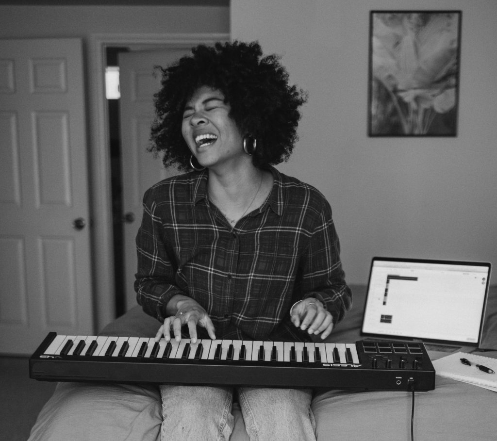 When I looked up toward the mirror again, she was rising from the ground, and we were walking to her second-hand piano keyboard. As she sat at the bench, I could see it was a Roland F-30; a very good digital piano in any decade, mine or hers. There’s an apparatus clipped to a standing lamp—somehow I instantly know this is where she records her music and videos. The more time I’ve spent with her, I was able to then feel that music, out of all the other things—celebrity autobiographies, yoga, even her facial routine—music was hers and no one else’s. A calmness came over her, and I sat, waiting to see what she would do.